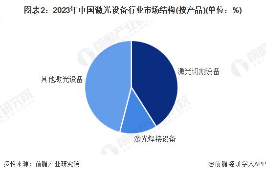 激光设备细分市场包括用于激光加工的激光通用设备,以及用于激光显示、激光医疗、激光测量、3D 打印等众多专业领域的专用激光设备。从实际数据来看,当前我国激光设备市场以用于激光加工的激光通用设备,主要设备包括激光切割机、激光焊接机和激光打标机等。2023 年我国激光设备行业市场中激光切割设备占比超过 40%。
